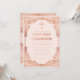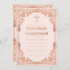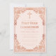 Este elegante convite à comunhão de ouro rosa e cor-de-rosa-esbranquiçado com ar vintage, recomendado para uma menina, tem um quadro de folha de ouro rosa ornamentado (faux) com decorações barrocas elegantes sobre fundo rosa-pincel. Acima do texto, há uma cruz religiosa em ouro rosa. Exceto a ocasião "Primeira Comunhão Sagrada", que também está em ouro rosa, todo texto pode ser personalizado e tem uma cor similar à do quadro do ouro rosa. A safra, quadro de ornamentado, baseia-se numa antiga ligação francesa ao cobrir de livro, de Georges Mercier (1885-1939) - Madame de Maupin, por Theophile Gautier, edição de 1911, agora no dominio público.
