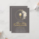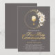 O Elegante Primeiro Convite Comunitário. Design apresenta uma coroa floral branca, um cálice dourado falso e wafer (comunhão sagrado), um roteiro de tipografia ''first sagry communion'' em letras de moda, detalhes em uma fonte moderna e em negrito sobre um fundo de cinza brilhante.
