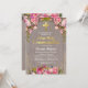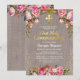Convite de primeira comunhão para meninas com fundo de madeira rústica, brilho dourado espalhado, belo arranjo floral em aquarela rosa, título em folha dourada, cruz religiosa e modelo de comunhão personalizável.