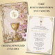 Celebrar o Sacramento da Primeira Comunhão é uma ocasião maravilhosa. Este tradicional vintage católico, desenhado por costumes, First Sagrada Communion Invitation apresenta uma bela imagem do Chalice e do Anfitrião, o Eucharista sobreposto em um quadro de ouro ornamentado, acentuado com um design floral cor-de-rosa. Todo texto e fontes podem ser modificados facilmente.