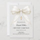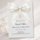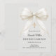 Convide os convidados com este sofisticado convite de Primeira Comunhão. O design apresenta um luxuoso laço de cetim marfim adornado com pérolas delicadas e uma cruz dourada brilhante sobre um fundo suave cinza pombo. É uma escolha linda para uma jovem que celebra seu sagrado sacramento católico.