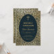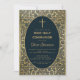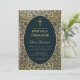 Este convite de primeira comunhão elegante com um ar vintage tem uma moldura dourada antiga com decorações de folhas de ouro espiraladas em um fundo azul-marinho escuro. O texto está dentro de uma oval com borda dourada e tem uma cruz de ouro acima dele. O nome do menino é escrito em uma fonte caligráfica elegante. Todo o texto pode ser personalizado e tem uma cor dourada semelhante às decorações de ouro da moldura.
