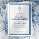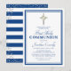 Convite de primeira comunhão para menino com um fundo branco simples que pode ser alterado para qualquer cor, uma borda dupla azul-marinho, uma cruz prateada religiosa com flores brancas e um modelo de comunhão sagrada que é fácil de personalizar. O verso apresenta listras náuticas azuis e brancas e brilho prateado.