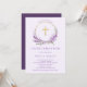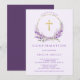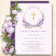 Lindos convites da Primeira Comunhão com uma coroa lilás lavanda e uma cruz sobre fundo roxo claro. Vire nosso convite para ver um verso coordenado para um toque especial extra.