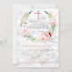 Crie o convite perfeito para a Primeira Comunhão da sua filha com esta bela cruz rosa, peônia e design floral de aquarela rosa com mármore falso carrera e tipografia de guião com letra de mão. Copyright Elegant Invites, todos os direitos reservados.
