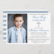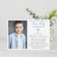 O moderno Elegante Dusty Blue e Silver Primeiro Convite à Comunhão com Cruz e Foto. Bandas brancas e azuis nas costas.