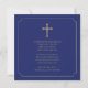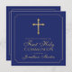 Perfeito para o primeiro convite de comunhão do seu filho, esta design é simples e pura com uma cruz de ouro falsa e uma fina estrutura de ouro sobre fundo azul marinho. Na frente está o nome de seus filhos em uma tipografia moderna em dourado falso. Na parte de trás do cartão está uma pequena cruz de ouro e os detalhes de sua celebração para você personalizar. Projetado apenas para você pela artista ©Susan Coffey.