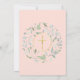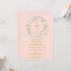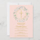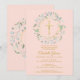 Uma grinalda decorativa verde e uma cruz dourada repousam sobre as informações do seu convite especial de primeira comunhão em um fundo rosa bege.