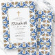 Composto por tipografia serif e escrita cursiva. Tudo contra um pano de fundo de azulejos brancos e azuis espanhóis mediterrânicos Este foi projetado por materiais de seleção, exclusivos para o Zazzle. Disponível aqui: http://www.zazzle.com/store/selectpartysupplies