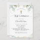 Convite Elegante da Primeira Comunhão com elegante Eucalyptus verde e manchas de aquarela, ideal para ambos, garoto ou menina Primeira Comunhão. Detalhes modernos e elegantes da caligrafia manuscrita. Capacidade de adicionar detalhes de cerimônia/Sacramento e recepção ou brunch, almoço, janto e reunião. De volta com um belo fundo aquoso. Parte da nossa coleção "Elegante Verde Eucalyptus Wedding and Events" com uma variedade de produtos coordenadores disponíveis. Estilo moderno, elegante e simples.