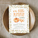 Convide convidados para a primeira festa de aniversário do seu filho com os nossos convites para a festa da Pequena Pumpkin! A primeira festa de aniversário do tema de outono convida a apresentar "nossa abóbora está girando uma" em um estilo de fonte laranja, com letra manuscrita, com uma abóbora aquarela como o "o" em uma. Os detalhes da festa de aniversário do seu filho são enquadrados por lindas folhas verdes de aquarela e flores amarelas. No verso do convite figura um design de papel kraft verde-oliva.