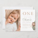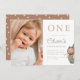 Um design bonitinho e mínimo, com "um" em letras séricas clássicas impressas no topo da placa. Abaixo, o nome do aniversariante está em letras verdes. Os detalhes da festa estão alinhados à esquerda, com um ursinho pintado à mão, vestindo um chapéu de festas, macacos verdes, e segurando uma pequena bandeira à direita. À esquerda, há uma foto do aniversariante. Cartões invertem um padrão de estrela fofo contra um fundo castanho quente. Ideal para o piquenique do ursinho de pelúcia, o primeiro aniversário da varinha e temas da floresta. Exibir a coleção vinculada nesta página para itens correspondentes ou visitar nossa loja para obter mais convites de festas de aniversários.