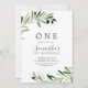 Este moderno convite para o primeiro aniversário da oliveira é perfeito para uma festa de aniversário de boho. O design rústico, porém elegante, apresenta folhas botânicas de cor aquática simples e azeitonas pretas num pequeno galho com um toque mediterrânico clássico.