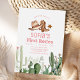 Os primeiros temas de aniversário do Rodeo são Aniversários de criança especiais, e este convite pode ajudá-lo a fazer uma festa de aniversário memorável. Caligrafia elegante sobre fundo lasso cercado por acessórios de cowboy: chapéu, crachá do xerife e botas com escovas e cacto de aquarela.