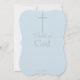 Elegante Primeira Comunhão para Filho. Uma simples cruz prateada pintada manualmente com sotaques dourados. O Nome da Comunhão e da Criança está escrito em um script azul. Personalizar com o Nome do Primeiro e do Meio do Filho ou Nome do Primeiro Nome. Inserir data e detalhes em texto preto. A parte de trás tem uma cruz prateada mais escura e o texto, Criança de Deus contra a cinza azul-clara. Arte original e Design por © 2018 TamiraZDesines.