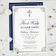 Cartões de convite da Santa Comunhão com uma bela trama traçada em tons de prata. A tipografia do cartão apresenta uma fusão de elegante caligrafia e texto moderno minimalista em tons de cinza prateada e azul marinho. A parte frontal da placa é branca, enquanto a parte traseira é marinho azul com Cross e frame. Disponível em impressão de alta qualidade ou para download, oferecendo formato de download digital instantâneo para mensagens de texto, e-mail ou postas de mídia social.