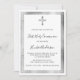 Um moderno, elegante e convite. Um fundo branco decorado com uma cruz, falsos quadros prateados. Personalize e adicione um nome e detalhes. Texto preto.