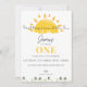 Celebre seu primeiro marco do ano com este divertido tema de aniversário "Primeira viagem ao redor do Sol". Sol amarelo brilhante brilhando sobre grama e flores em fundo branco. Cartões editáveis - personalize-os adicionando seu texto. Perfeito para a festa de aniversário de qualquer criança.