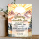 Boho e design de 1º aniversário, rústico e neutro, "Primeira viagem ao redor do sol" com uma paisagem ao estilo aquarela com montanhas, árvores de abeto e um sol ascensão.