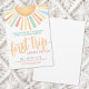 Celebre a primeira viagem ao redor do Sol com este brilhante e alegre convite de festas primeiro aniversario. No topo, a "Primeira Viagem" é destacada na caligrafia em negrito, definindo o tom para uma celebração alegre. Um sol grande com raios vibrantes em feixes amarelos, laranja, vermelhos, lacerantes e azuis, criando um tema divertido e colorido. A parte inferior do convite inclui todos os detalhes do evento, estilizados em uma mistura de fontes modernas e tipografia de scripts ousados, com cores que correspondem aos raios solares. A parte de trás do convite é deixada simples, mas você pode personalizá-lo com um fundo de cor sólida se quiser corresponder ao seu tema. Esta design divertida e vibrante combina elementos fofos, retrorados e modernos, fazer-a perfeita para celebrar o primeiro ano do seu filho. Disponível como um convite impresso ou como um convite digital para download que você pode enviar por e-mail ou que foi impresso localmente!
