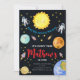 Primeira Viagem Em Torno Do Convite Ao primeiro aniversario Exterior Do Sol. Esta adorável primeira viagem ao redor do design de sol com planetas bonitinhos coloridos, espaçonave de foguetes, astronautas.