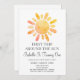 Um doce sol brilhante, estilo jato de ouro laranja, com raios, primeira viagem ao redor do sol, convite de aniversário de criança estilo aquarela. Uma cor d'água laranja esmagada e arrojada.