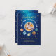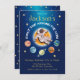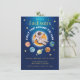 Celebre o primeiro aniversario do seu filho ou filha com o convite do tema espacial. Possui um astronauta segurando planetas de balão no céu espacial com estrelas de ouro falsas. Houston, temos um ano, para a primeira viagem ao redor do texto do sol.