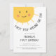 Primeiro convite de aniversário bonito e moderno com uma ilustração de um sorriso solar. Ilustrada e projetada por Patricia Alvarez.