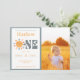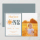 Convite de primeiro aniversário primeira viagem ao redor do sol. Tema de festa de 1º aniversário neutro para menino ou menina. Gráficos solares alegres e fofos com tons terrosos. Conjunto de decoração de festa em tons pastel verde, amarelo, azul e laranja, com fonte clara e fundo transparente.