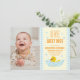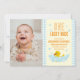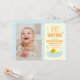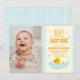 Um pato sortudo! Primeiro aniversário com pato de borracha e bolhas contra um gingham azul claro e fundo amarelo pálido com texto laranja. Modelo de foto via Pixabay licenciado sob CC0 e deve ser substituído por sua própria foto