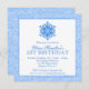 Um convite de aniversário moderno de inverno. Apresentando falso brilho e floco de neve em azul. Designs são gráficos impressos em formato plano - NÃO É VERDADEIRO GLITTER.