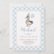 Celebre o dia especial do seu pequeno com este charmoso convite de aniversário de "Pato Sortudo"! Apresentando uma ilustração esbranquiçada de um pato apper vestindo um chapéu azul de festa mutado e segurando um balão branco, esta design é moldada por uma fronteira de xadrez clássica para um toque de retrorelegância.