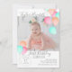 Balões brilhantes e coloridos convite para fotos de aniversário para primeiro aniversario de bebê ou qualquer idade. Balões de hélio festivos e de coração leve em tons tropicais de cor rosa fuchsia, laranja tangerina e azul turquesa decoram bem o quadro fotográfico e as delicadas fontes de cinza de guião manual se coordenam bem. Data da festa em um círculo geométrico moderno com um estilo de texto minimalista.