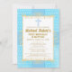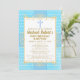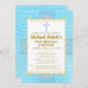 Convide sua família e amigos para o primeiro aniversário e batismo da sua filha. A design azul e dourada contém elementos decorativos de ouro e bolinhas brancas sobre fundo azul de aquarela. Todo o texto pode ser personalizado, incluindo o serviço religioso e os detalhes do partido.