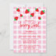 Convite para primeiro aniversario de morango doce de berço com fundo de fruta vermelha e estilo de prancha de xadrez.