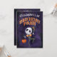 Celebre um aniversário espetacular de outubro com um convite temático de Halloween. Tema de cor Roxo, Preto e Laranja de outubro. Perfeito para celebrar o seu primeiro aniversario de abóboras. Possui um esqueleto de dança giro e alegre e fantasma flutuante. Convide a família e os amigos a uma festa de figurante para honrar o seu pequeno.
