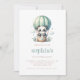 Este belo primeiro convite de aniversário apresenta um doce panda de aquarela em um balão de ar quente verde-menta cercado por nuvens e flores cor-de-rosa, acima das palavras "junte-se a nós para a primeira festa de aniversário de [nome]!" em letras itálicas marrons. Personalize-o com o nome do seu filho em letras esboçadas em verde-menta, com os detalhes em fontes sans serif castanhas em um fundo branco. Ideal para panda, aventura, viagem ou balão de ar quente de uma garota, a primeira festa de aniversário.