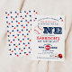 Primeiro convite de aniversário com um tema de beisebol, com um fundo branco clássico, texto azul e vermelho do marinho, beisebol, estrelas, capacete com taco e bola e modelo moderno de festa de aniversário que é fácil de personalizar.