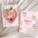 Design apresenta tons rosas e vermelhos suaves com fundo gingham. Junto com morango encantador e margaridas. Uma serifa ousada para 'Berry', combinada com uma fonte de script para 'first', cria uma mistura lúdica e atraente.