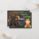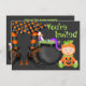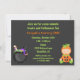 Convite para primeiro aniversario de Halloween Personalizado Bonito para Meninos e Meninas. Possui um bebê bonitinho em uma fantasia de abóbora com as pernas de bruxa da mãe e um caldeirão assustador. artwork©delightful-doodles.com *