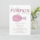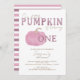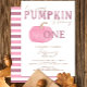 Celebre o primeiro aniversário da sua menina com este doce e na moda! Apresentando uma abóbora cor-de-água cor-de-rosa-pincelada, uma escrita branca e um backer rosa-listrado, esta design é perfeita para uma celebração de aniversário de outono ou uma festa festiva de Ação de Graças. Personalize com seus detalhes de evento para uma manutenção de querido que captura o calor da estação e o momento mais importante de sua abóbora.