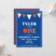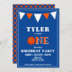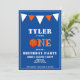 Convite para primeiro aniversario de Basquete Azul. Cartão de festa de aniversário de basquete bonito para o primeiro aniversario. O design tem uma grande bola de basquete e bandeiras de cor laranja e branca num fundo azul. Personalize este convite de aniversário com o nome de uma criança e uma fotografia e personalize todos os dados do convite. Excelente como convite de festas primeiro aniversario de menino.