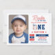 Celebre o primeiro ano do seu bebê com este adorável convite fotográfico temático de baseball, com sotaques vermelho e azul marinho audaciosos, um fundo listrado, e um dentro gráfico de boné de beisebol lúdico, a palavra "UM". Projetado em um layout horizontal, este design divertido e esportivo inclui um modelo de foto personalizável, fazer que facilita a exibição do mais bonito snapshot do seu pequeno enrolador. Ideal para um novato do ano, uma celebração com tema esportivo, ou uma festa de aniversário de beisebol, este convite é perfeito para os pais planejarem um primeiro evento memorável. Personalize com o nome do seu filho, informações da festa e detalhes de RSVP para uma manutenção única.