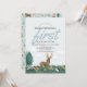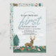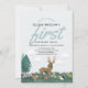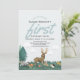 Este convite para primeiros aniversarios giro e rústico apresenta uma ilustração adorável de animais de floresta, com veado, ouriço, texugo, cogumelo, verde e flores, e espaço para adicionar o nome do seu menino ou menina, e detalhes de sua celebração. Na parte de trás do convite está um padrão de floresta coincidente com um capricho. O perfeito design minimalista neutro de gênero para qualquer aniversário de um ano!