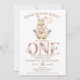 Boho Floral primeiro aniversario Coelhinho Coelho Convite à Primeira Aniversário da Boho com uma folha de ouro falso rosa com vários arranjos florais em tons naturais com grama-pampas, um coelho bonito e um balão. Ideal para alguém à procura de um convite de aniversário de uma jovem boêmia moderna.