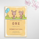 Adorável convite de primeiro aniversário amarelo com alguns coelhos. O convite tem um retângulo amarelo como cor de fundo com algumas flores brancas. Na parte superior, os coelhos marrons estão virados um para o outro na floresta. Um casal de balões azuis brilhantes está saindo de alguns arbustos. Abaixo da ilustração você pode encontrar todas as informações que precisa mudar para personalizá-la em cores marrom e cinza. Você pode clicar em personalizar ainda mais e alterar essas cores, a fonte e o tamanho. Ilustrada e projetada por Patricia Alvarez.