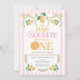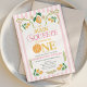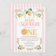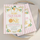 Primeiro aniversario Whimsical Pink Lemon Main Squeeze Convite para o primeiro aniversário de um limão doce, chamado limão doce, com arcos verdes e cor-de-rosa e arranjos de limão, padrão listrado rosa e uma palavra com uma fatia de limão. Esse cítrico nosso principal convite de primeiro aniversario de espreme também apresenta texto e imagens no verso.