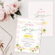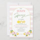 Primeiro aniversario de limão cor-de-rosa-palha principal Convite para o primeiro aniversário de um limão-de-rosa, limão-de-cor-de-rosa, modelo listrado cor-de-rosa e uma caligrafia moderna que se dirige a um arco branco. Esse convite principal de primeiro aniversario de aperto também apresenta uma palavra decorativa com uma fatia de limão que soletra uma.