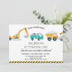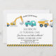 Primeiro aniversario de Construção de Caminhões Modernos Convite à construção de Uma Fita e construção moderna temem o primeiro convite de aniversário para o bebê, com vários veículos de construção de cinzas amarelas e azuis e caminhão de lixo verde azul. Este convite de aniversário de construção moderno poderia ser usado para qualquer idade.