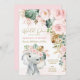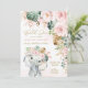 Celebre seu pequeno selvagem girando 1 com este belo convite de aniversário com uma ilustração adorável de um doce elefante bebê, verde tropical exuberante e belíssimas flores cor-de-rosa.